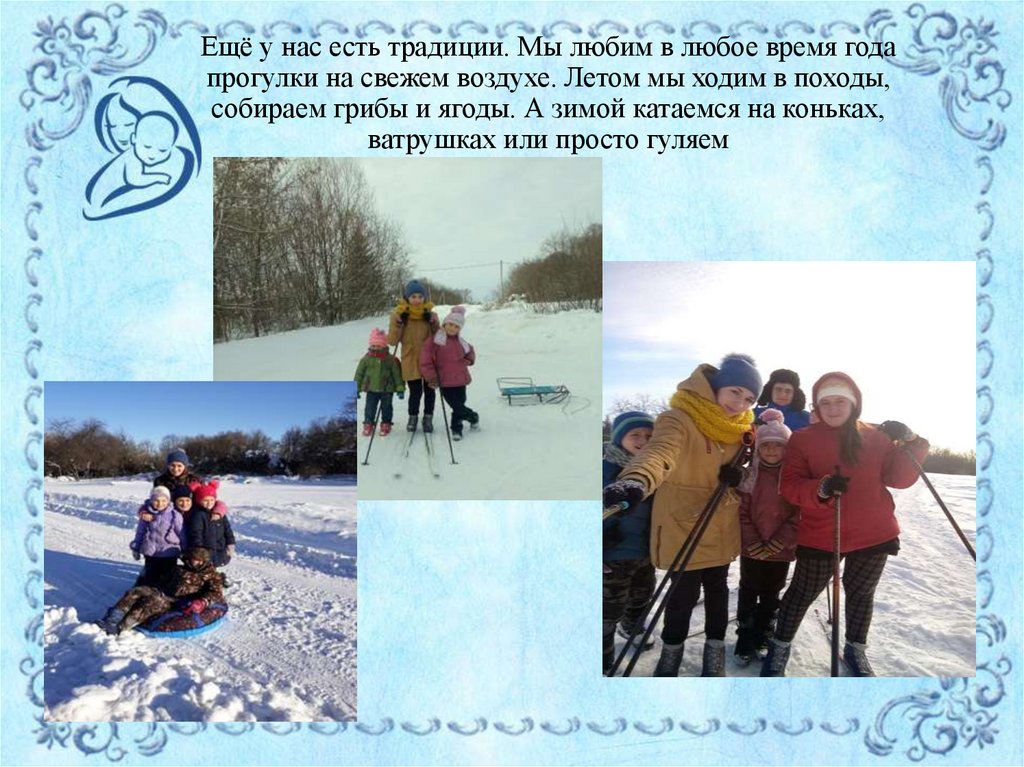 Ещё у нас есть традиции. Мы любим в любое время годапрогулки на свежем воздухе. Летом мы ходим в походы,
