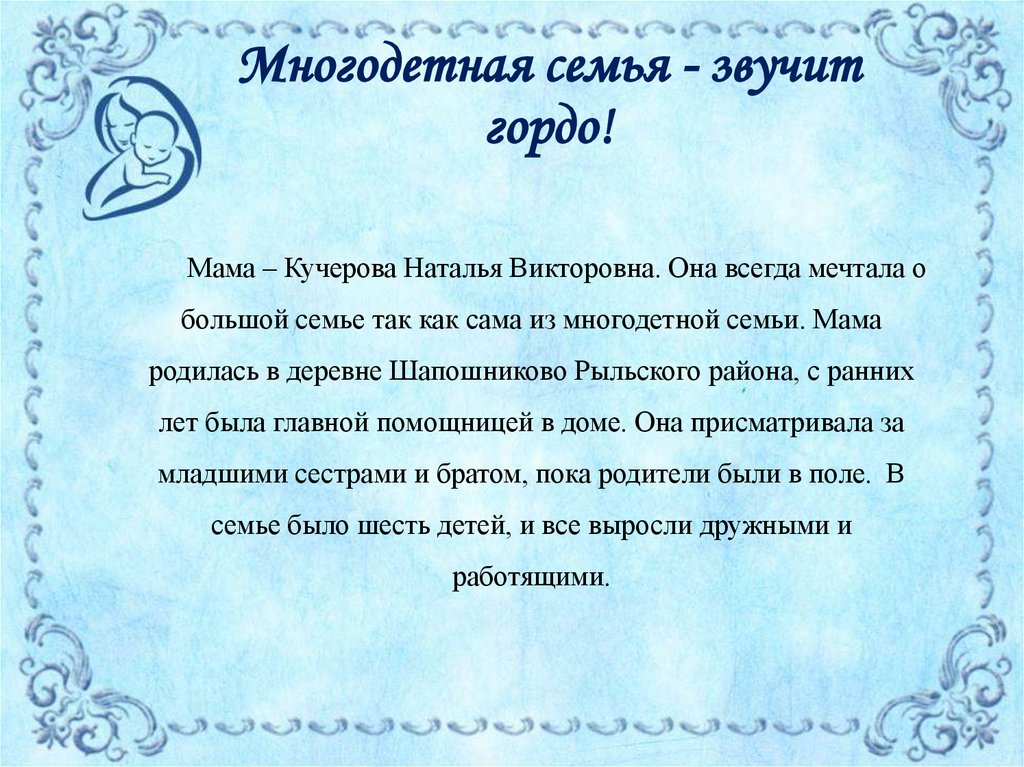 большой семье так как сама из многодетной семьи. Мама