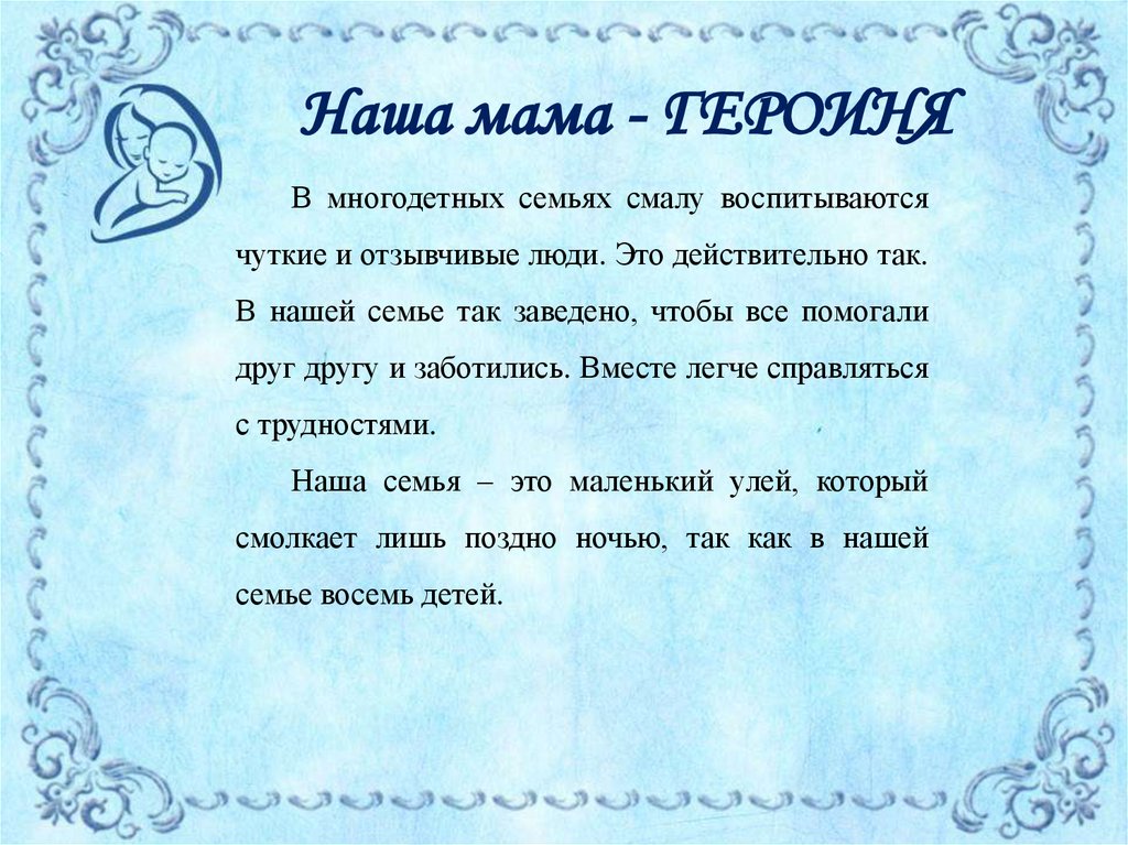 Наша мама - ГЕРОИНЯВ многодетных семьях смалу воспитываются