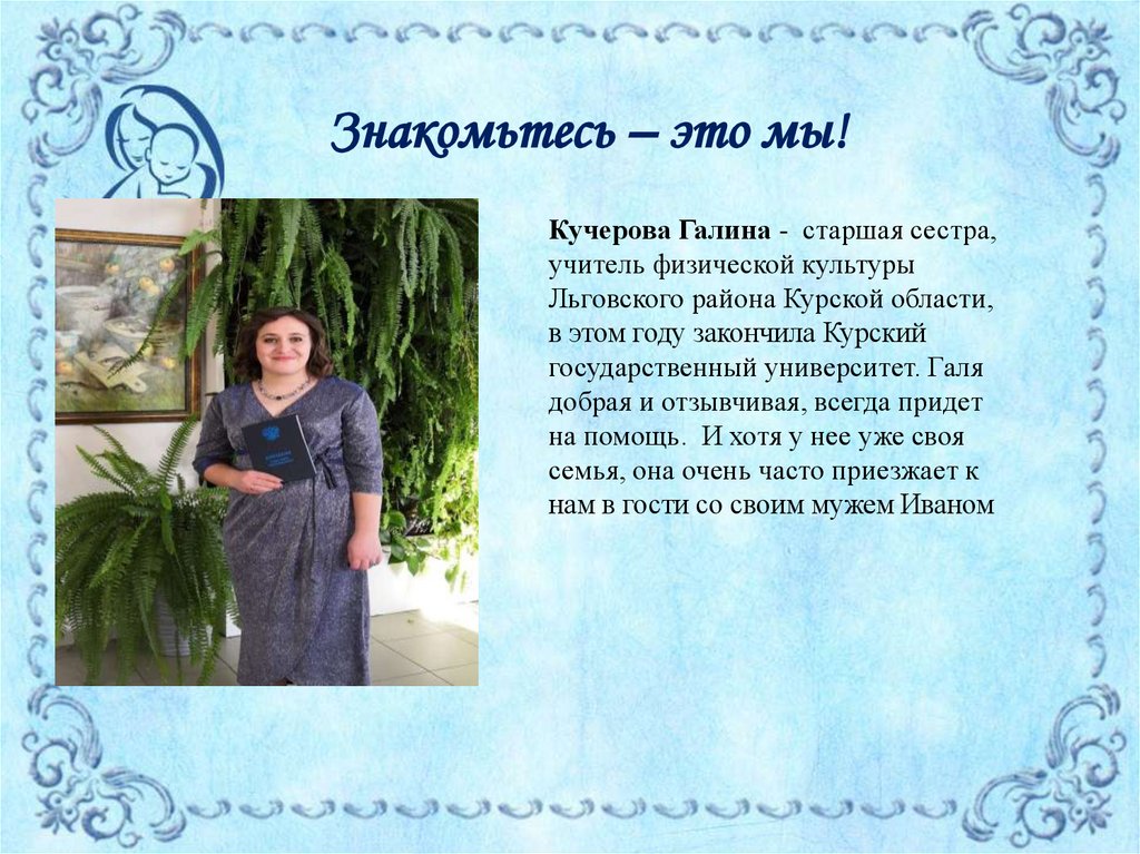 Знакомьтесь – это мы!Кучерова Галина - старшая сестра,