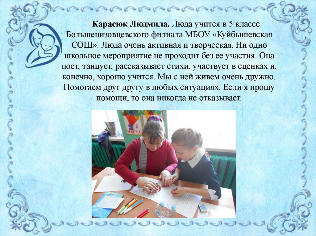 Карасюк Людмила. Люда учится в 5 классеБольшенизовцевского филиала МБОУ «Куйбышевская