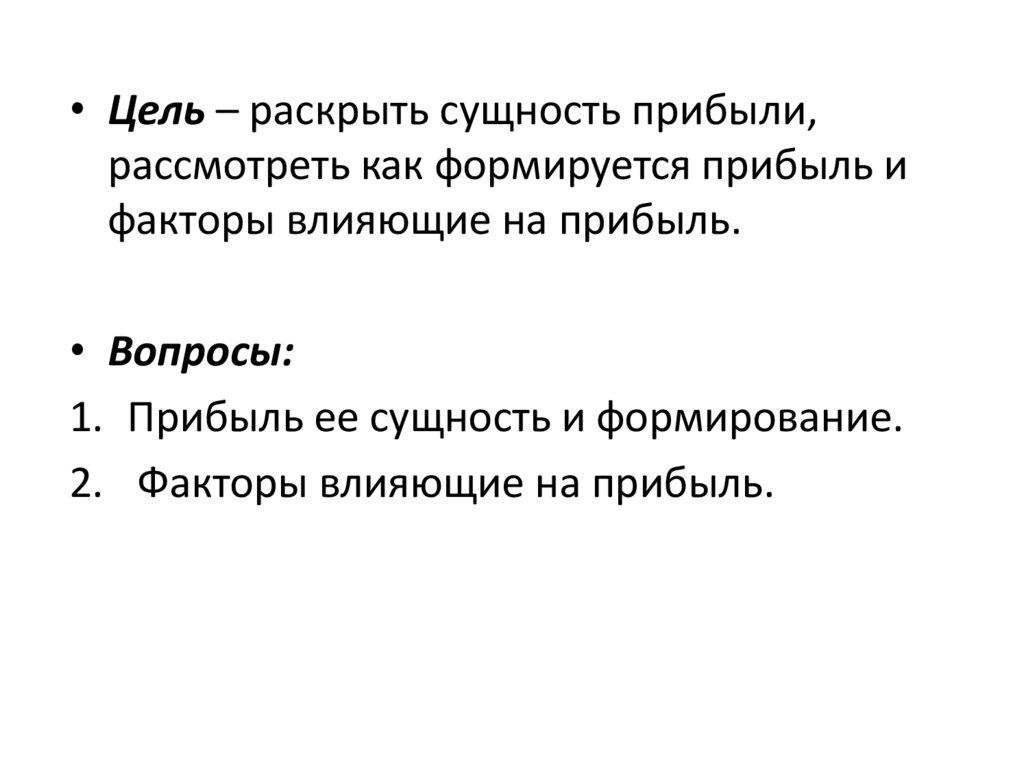 • Цель – раскрыть сущность прибыли,рассмотреть как формируется прибыль и