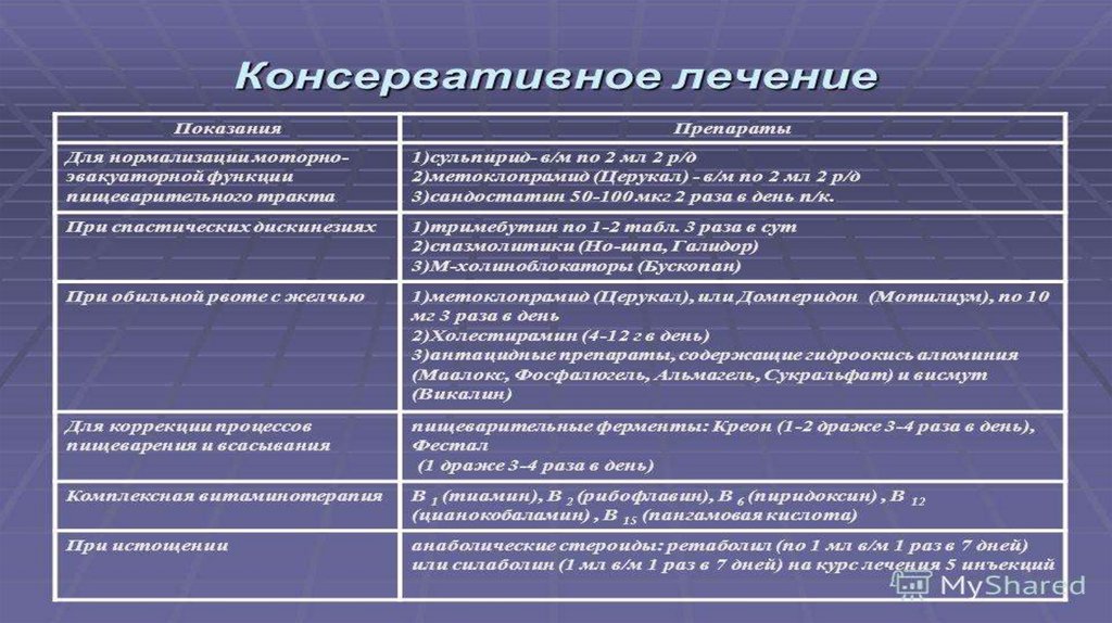 • При хронической форме СПП необходимо устранить анатомические условия, способствующие застою содержимого вприводящей петле вследствие механических причин.