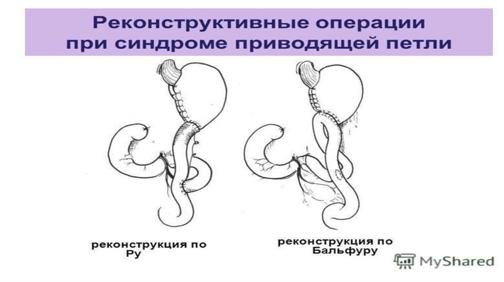 • Выраженный синдром приводящей петли с частой и обильнойрвотой желчью является показанием к операции — устранению
