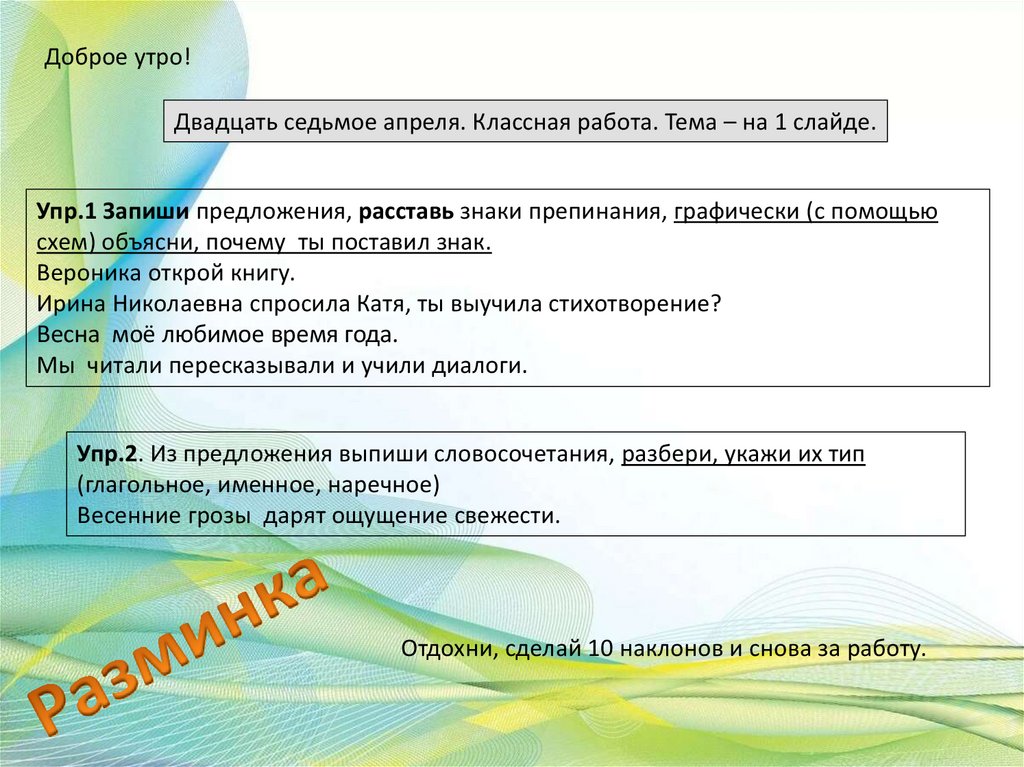 Доброе утро!Двадцать седьмое апреля. Классная работа. Тема – на 1 слайде.