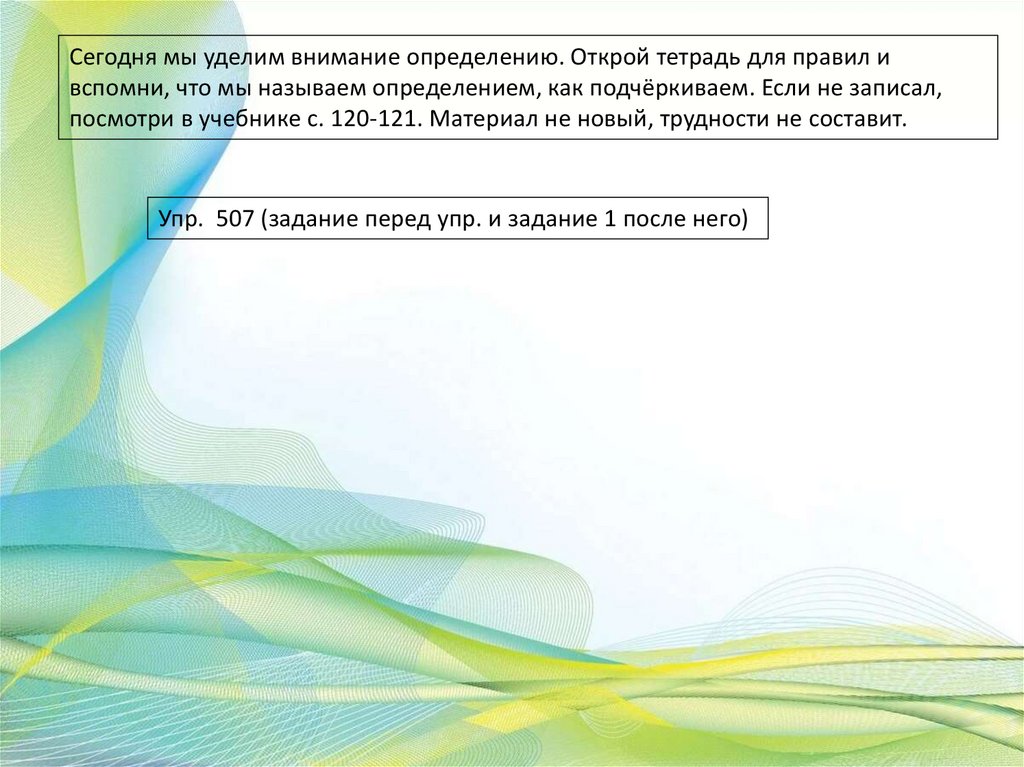Сегодня мы уделим внимание определению. Открой тетрадь для правил ивспомни, что мы называем определением, как подчёркиваем. Если не записал,