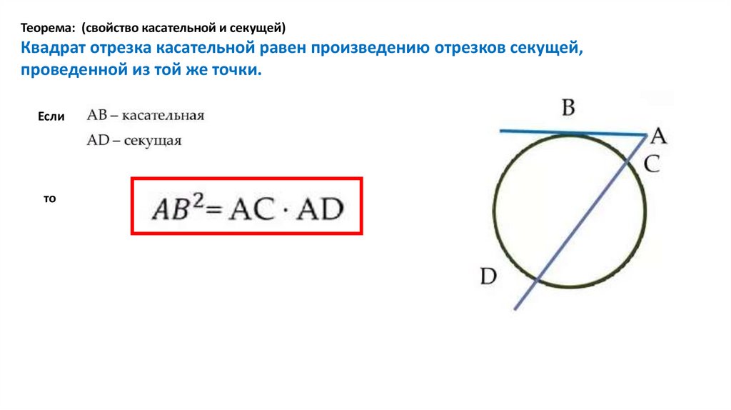 Теорема: (свойство касательной и секущей)Квадрат отрезка касательной равен произведению отрезков секущей,
