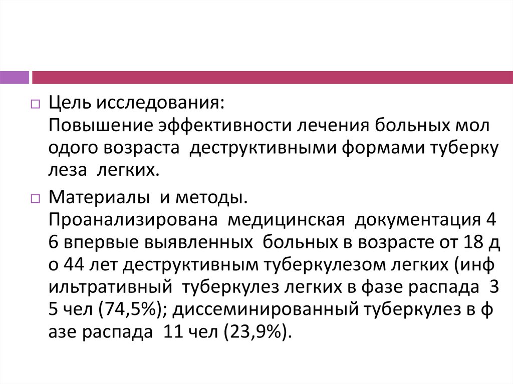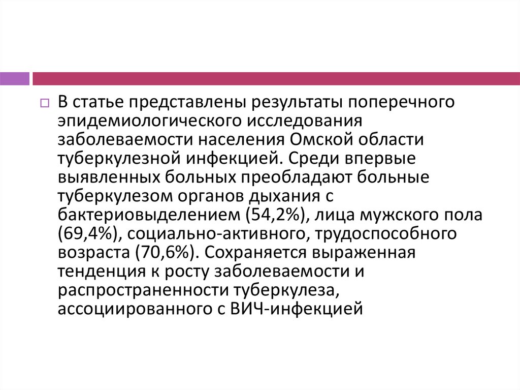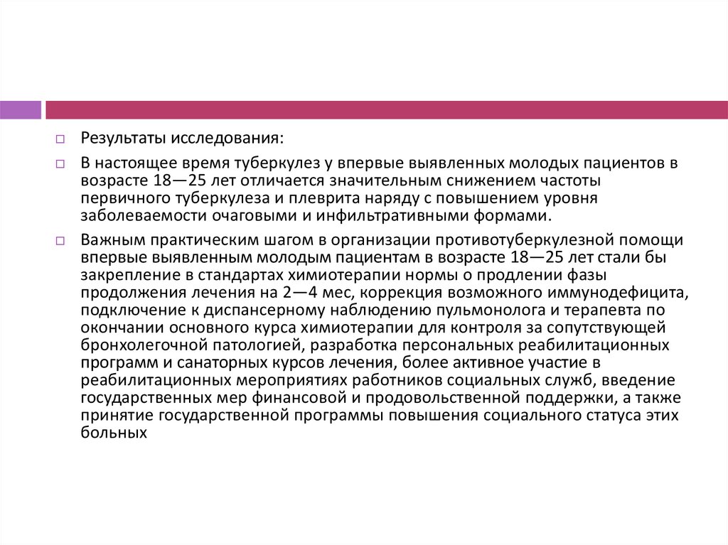 Результаты исследования:В настоящее время туберкулез у впервые выявленных молодых пациентов в