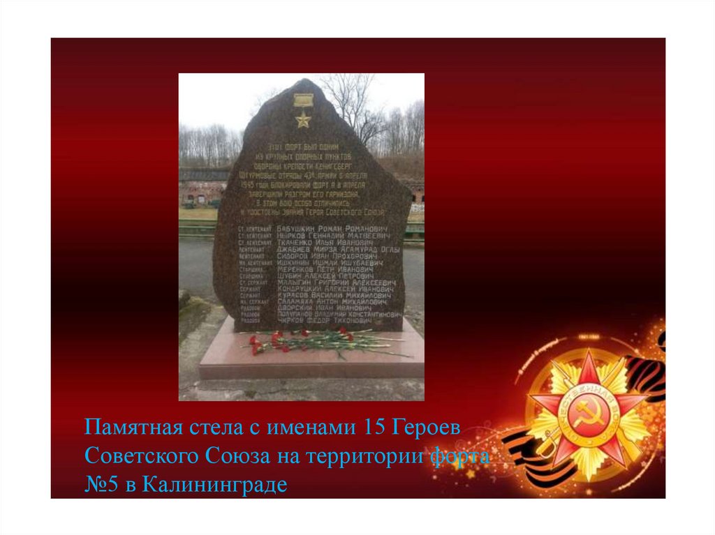 Памятная стела с именами 15 ГероевСоветского Союза на территории форта
