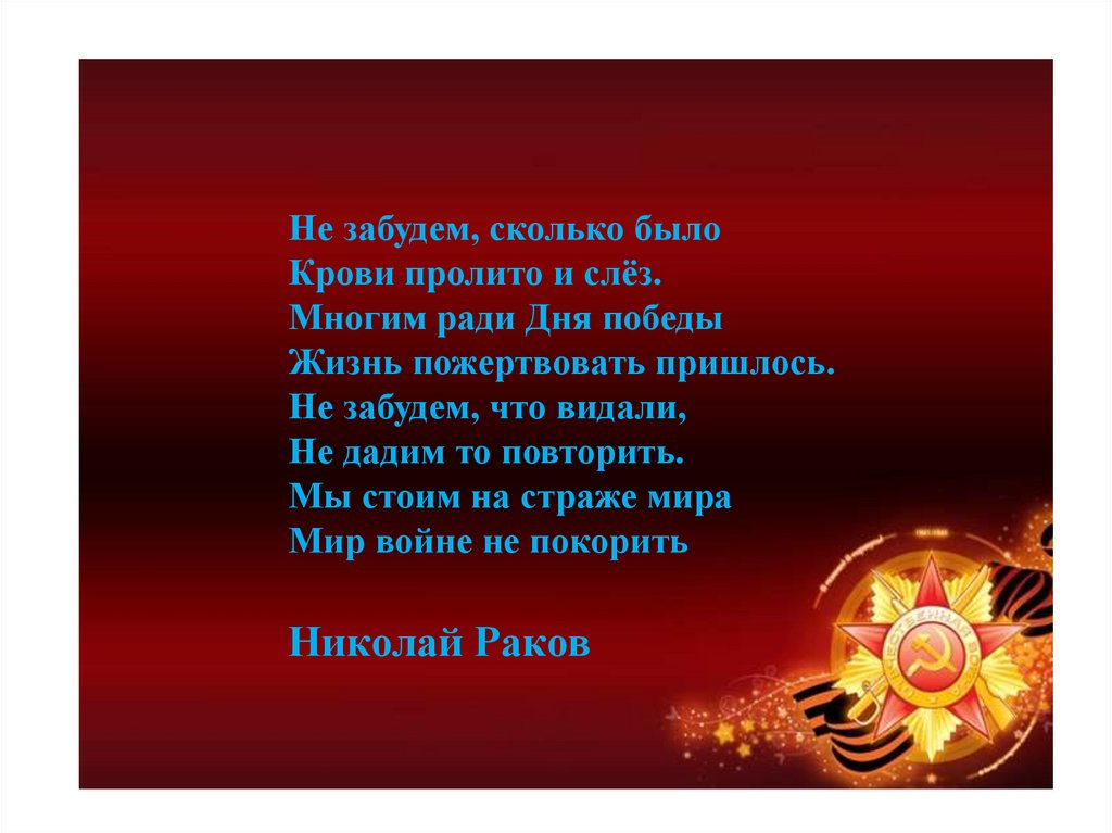 Не забудем, сколько былоКрови пролито и слёз.