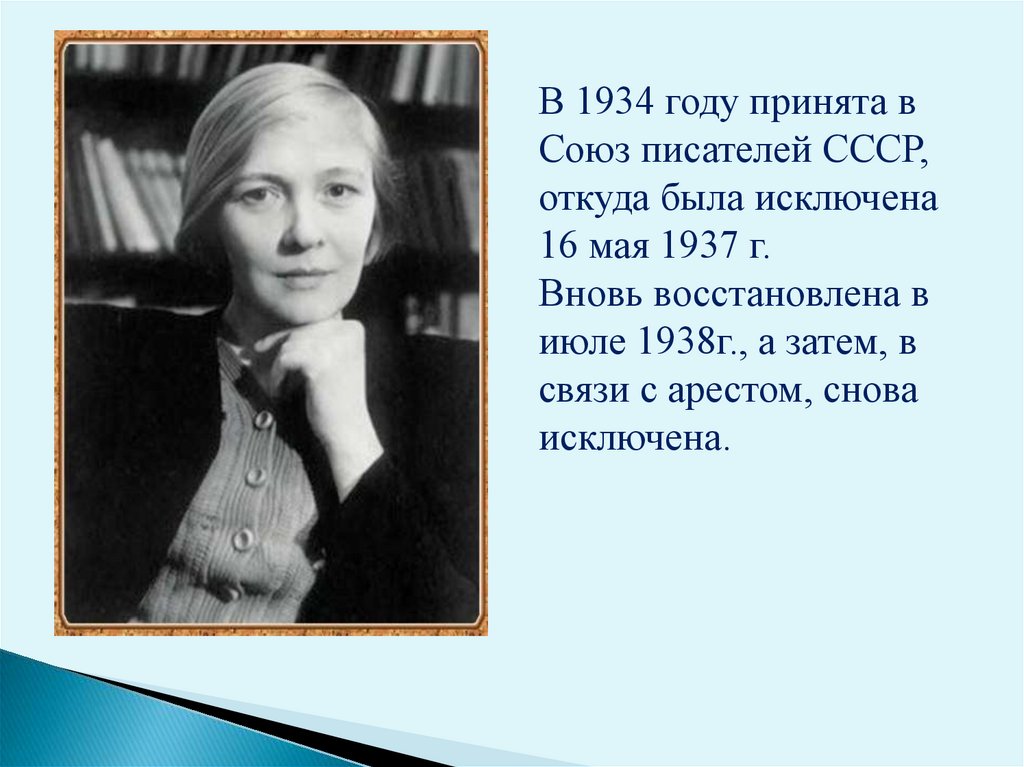 В 1934 году принята вСоюз писателей СССР,