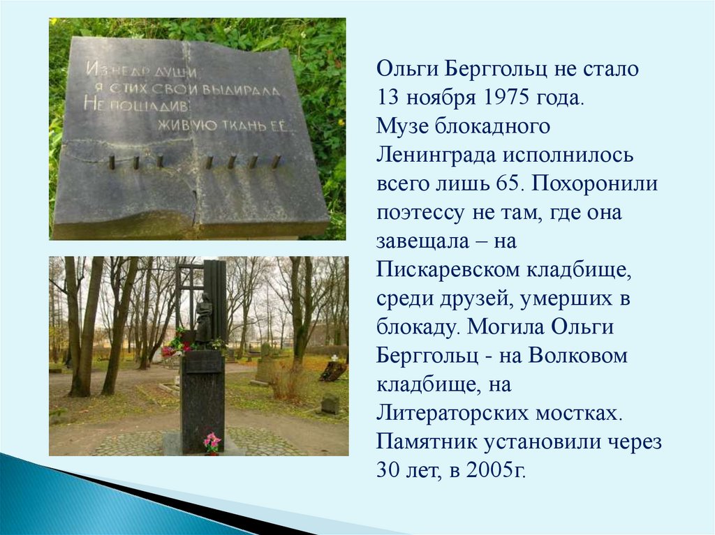 Ольги Берггольц не стало13 ноября 1975 года.