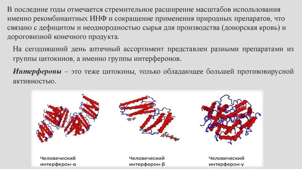 В последние годы отмечается стремительное расширение масштабов использованияименно рекомбинантных ИНФ и сокращение применения природных препаратов, что