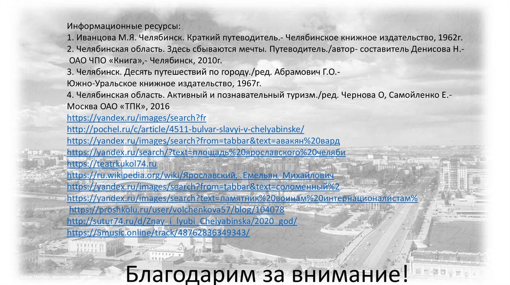 Информационные ресурсы:1. Иванцова М.Я. Челябинск. Краткий путеводитель.- Челябинское книжное издательство, 1962г.