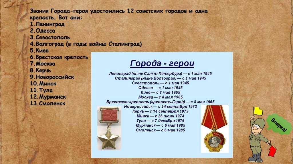 Звания Города-героя удостоились 12 советских городов и однакрепость. Вот они: