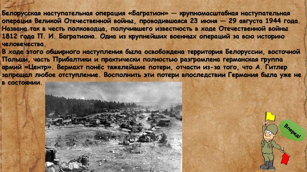 Белорусская наступательная операция «Багратион» — крупномасштабная наступательнаяоперация Великой Отечественной войны, проводившаяся 23 июня — 29 августа 1944 года.