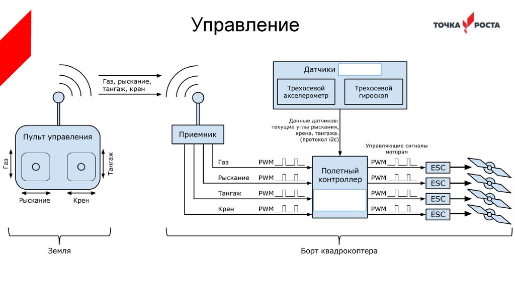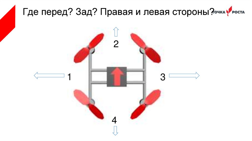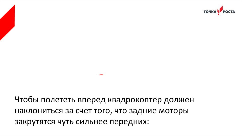 Чтобы полететь вперед квадрокоптер долженнаклониться за счет того, что задние моторы