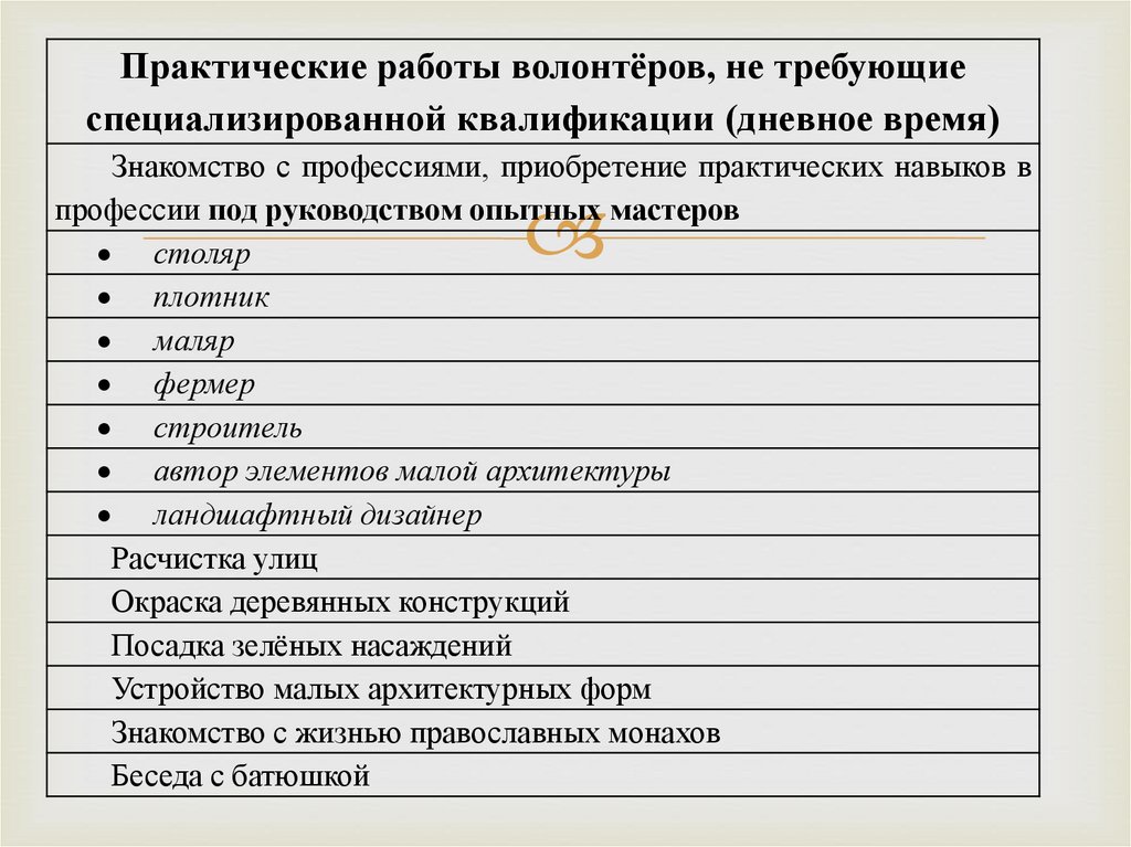 Практические работы волонтёров, не требующиеспециализированной квалификации (дневное время)