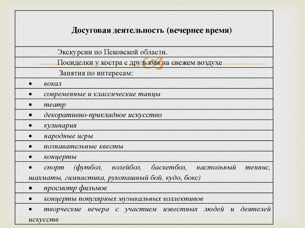 Досуговая деятельность (вечернее время)Экскурсии по Псковской области.