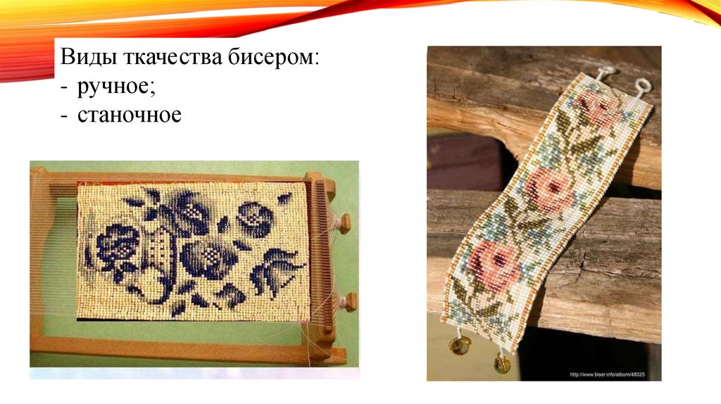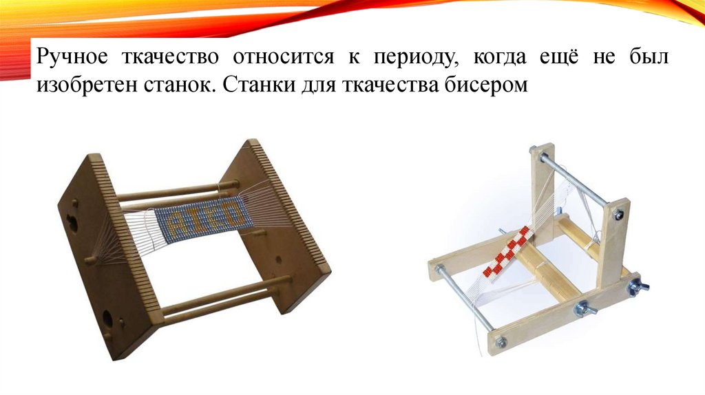 Ручное ткачество относится к периоду, когда ещё не былизобретен станок. Станки для ткачества бисером