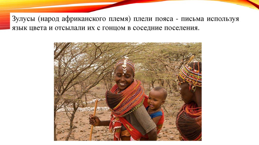 Зулусы (народ африканского племя) плели пояса - письма используяязык цвета и отсылали их с гонцом в соседние поселения.