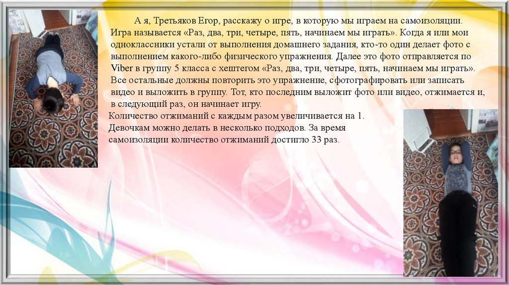 А я, Третьяков Егор, расскажу о игре, в которую мы играем на самоизоляции.Игра называется «Раз, два, три, четыре, пять, начинаем мы играть». Когда я или мои
