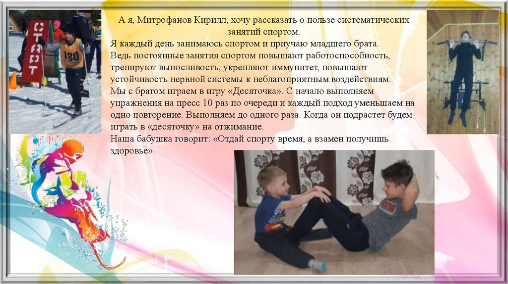 А я, Митрофанов Кирилл, хочу рассказать о пользе систематическихзанятий спортом.