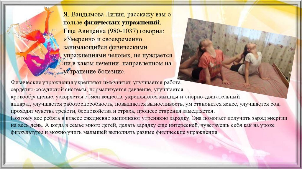 Я, Вандымова Лилия, расскажу вам опользе физических упражнений.