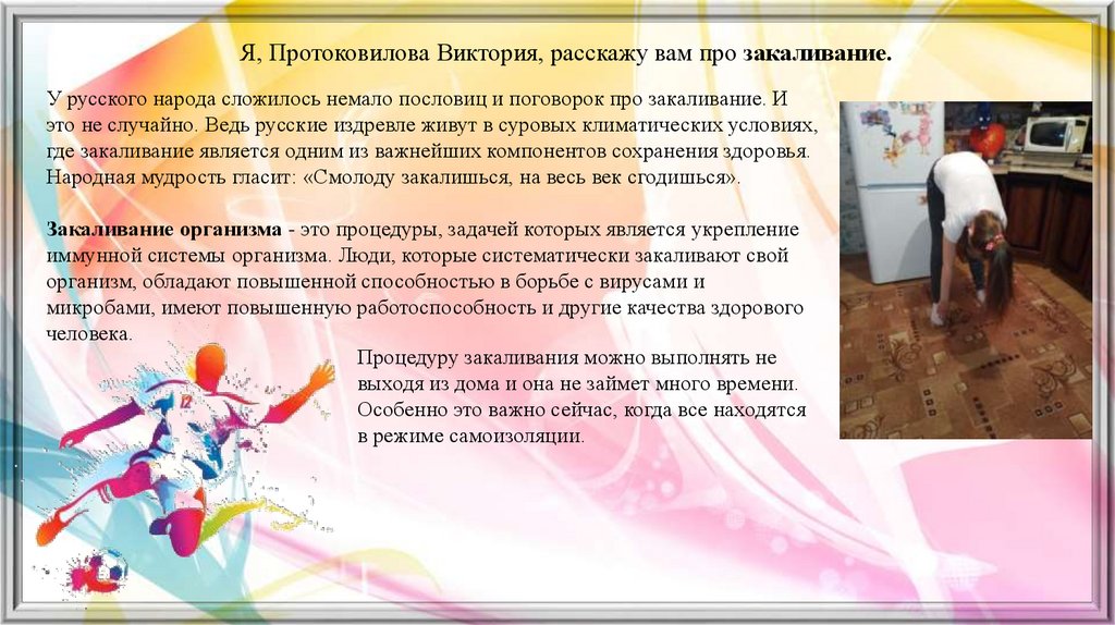 Я, Протоковилова Виктория, расскажу вам про закаливание.У русского народа сложилось немало пословиц и поговорок про закаливание. И
