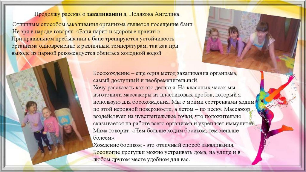 Продолжу рассказ о закаливании я, Полякова Ангелина.Отличным способом закаливания организма является посещение бани.