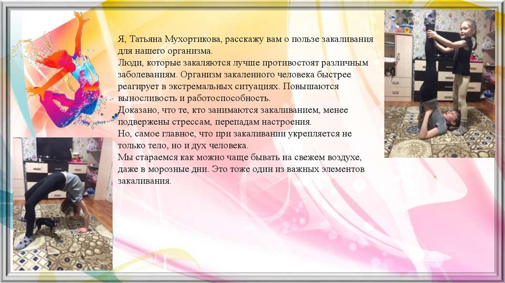 Я, Татьяна Мухортикова, расскажу вам о пользе закаливаниядля нашего организма.