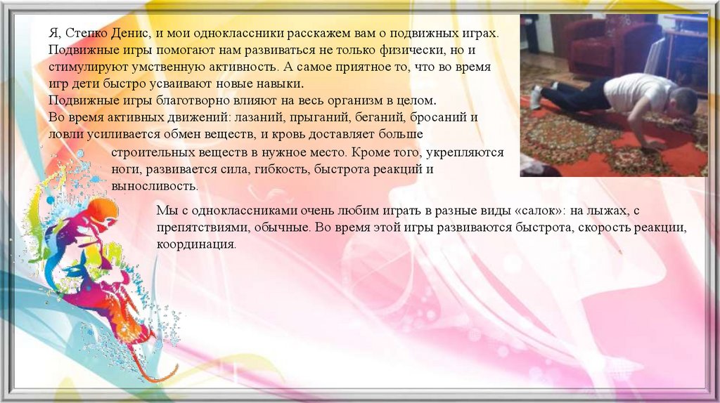 Я, Степко Денис, и мои одноклассники расскажем вам о подвижных играх.Подвижные игры помогают нам развиваться не только физически, но и
