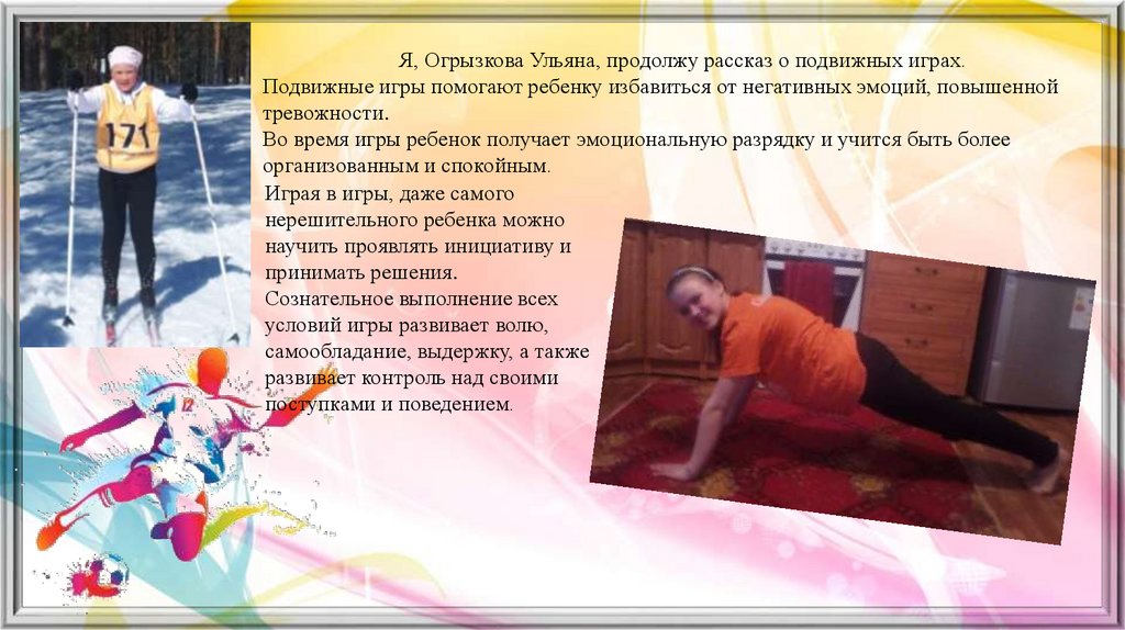 Я, Огрызкова Ульяна, продолжу рассказ о подвижных играх.Подвижные игры помогают ребенку избавиться от негативных эмоций, повышенной
