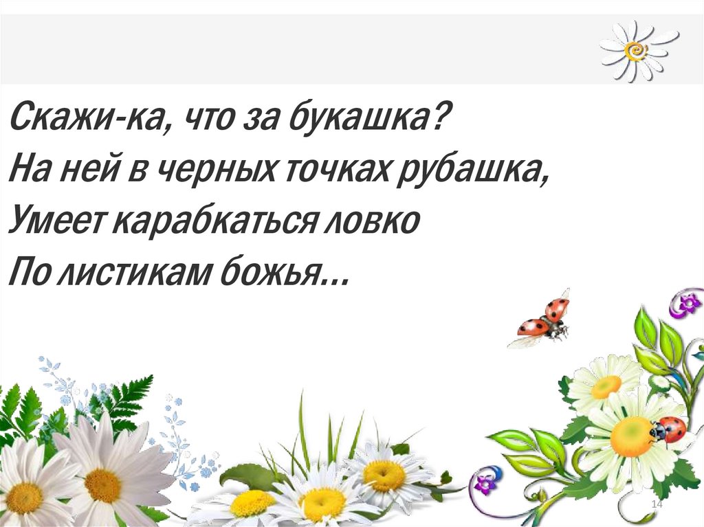 Скажи-ка, что за букашка?На ней в черных точках рубашка,