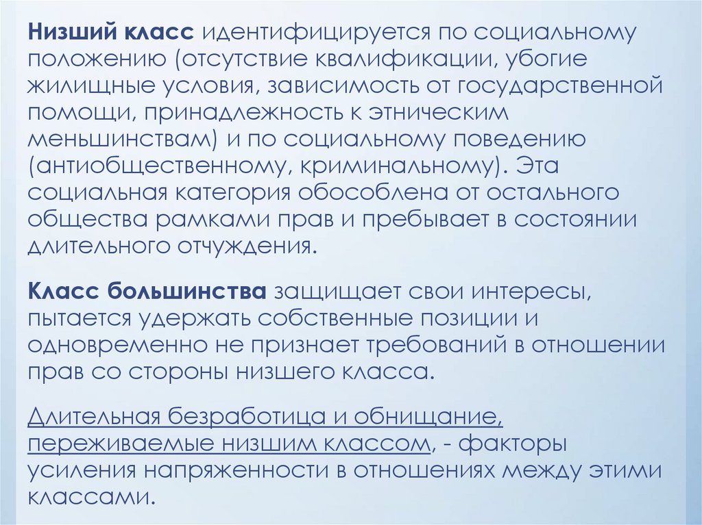 Низший класс идентифицируется по социальномуположению (отсутствие квалификации, убогие