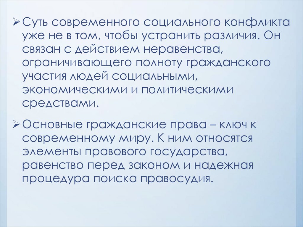 «Современный социальный конфликт - это антагонизм прав иих обеспечения, политики и экономики, гражданских прав и