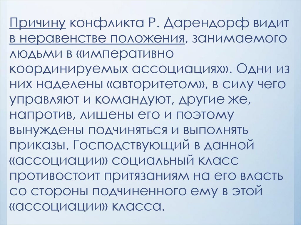 Причину конфликта Р. Дарендорф видитв неравенстве положения, занимаемого