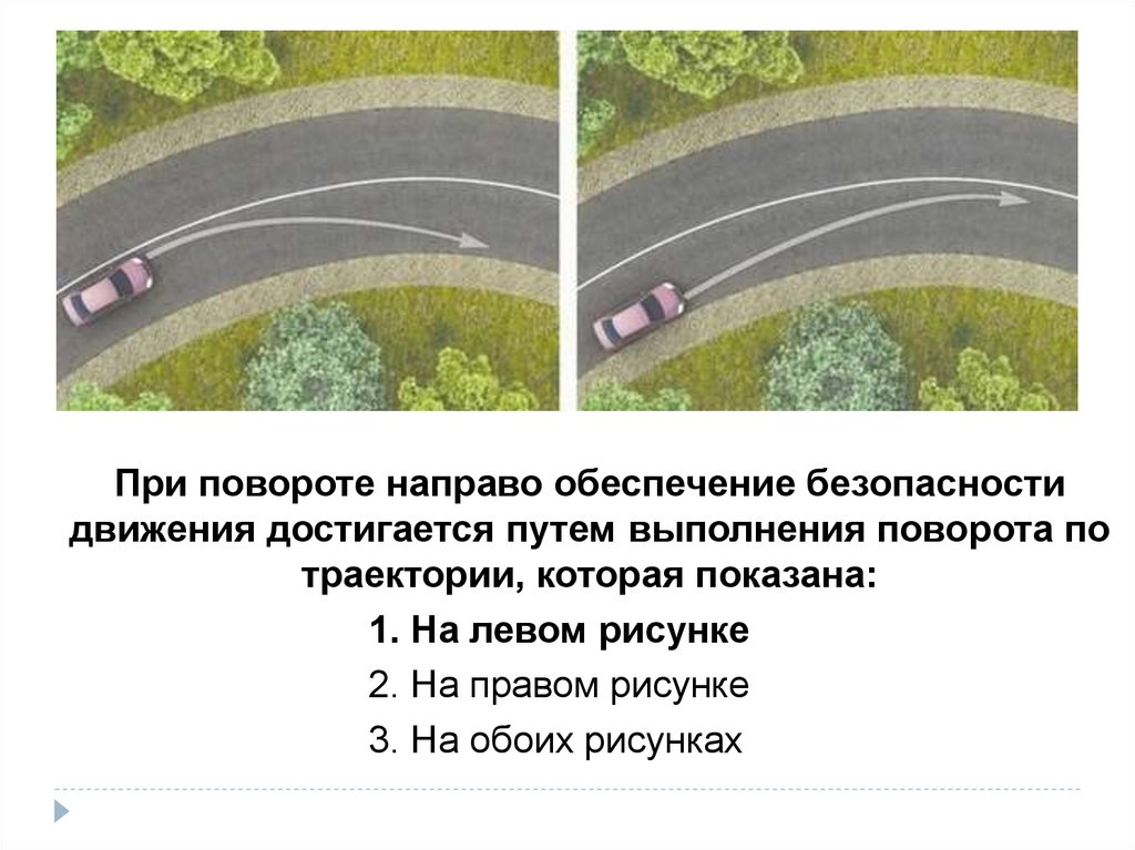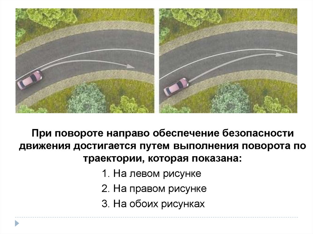 При повороте направо обеспечение безопасностидвижения достигается путем выполнения поворота по