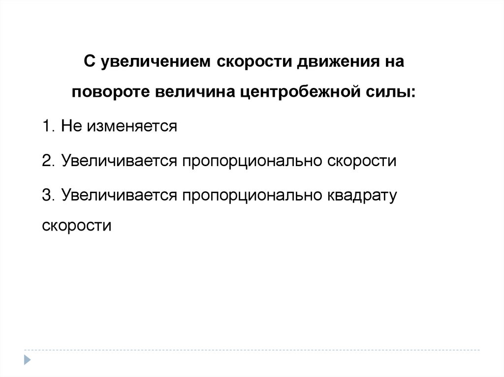 С увеличением скорости движения наповороте величина центробежной силы: