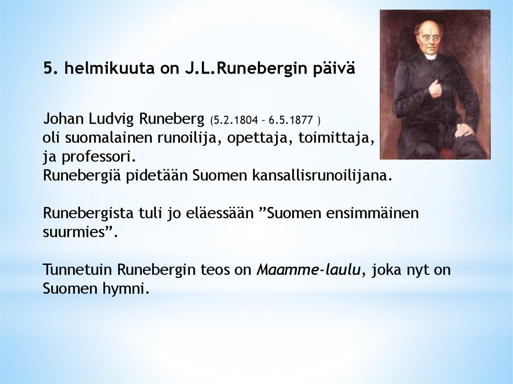 5. helmikuuta on J.L.Runebergin päiväJohan Ludvig Runeberg (5.2.1804 – 6.5.1877 )