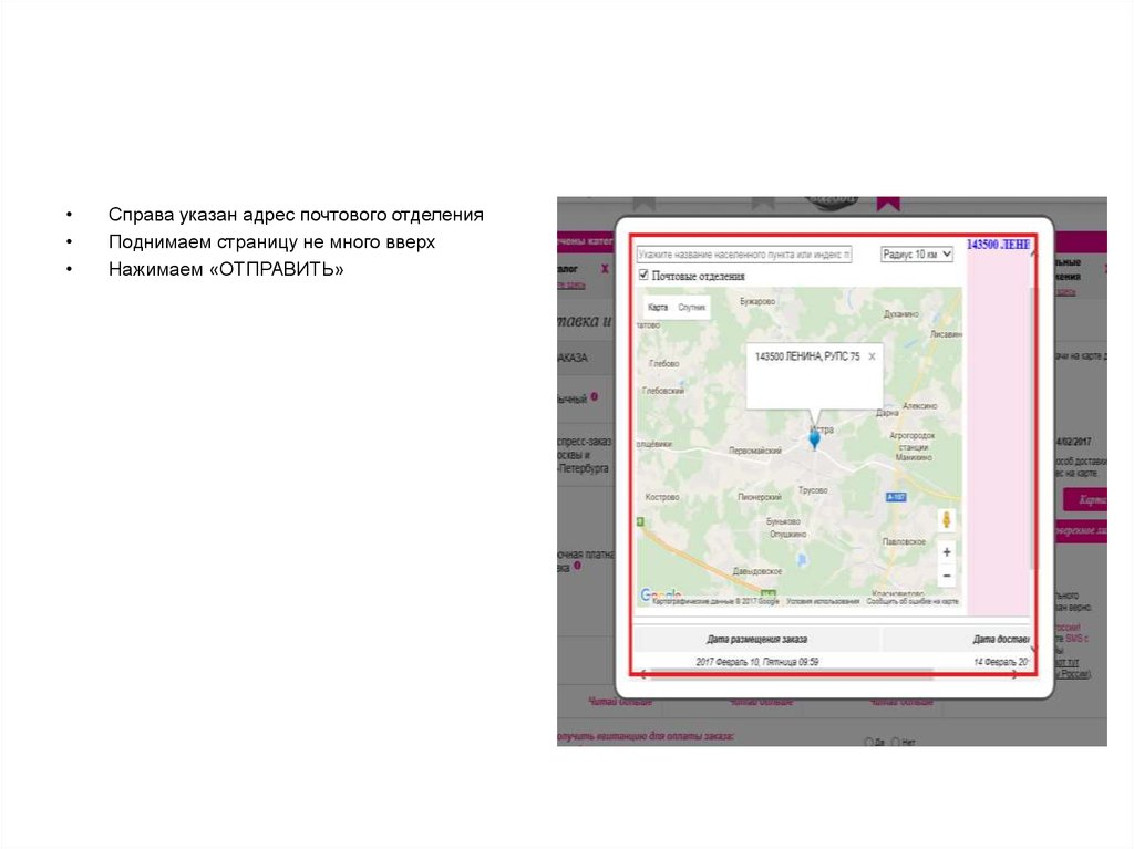 Доставку не по почте, для этого нужно нажать на «КАРТА»
