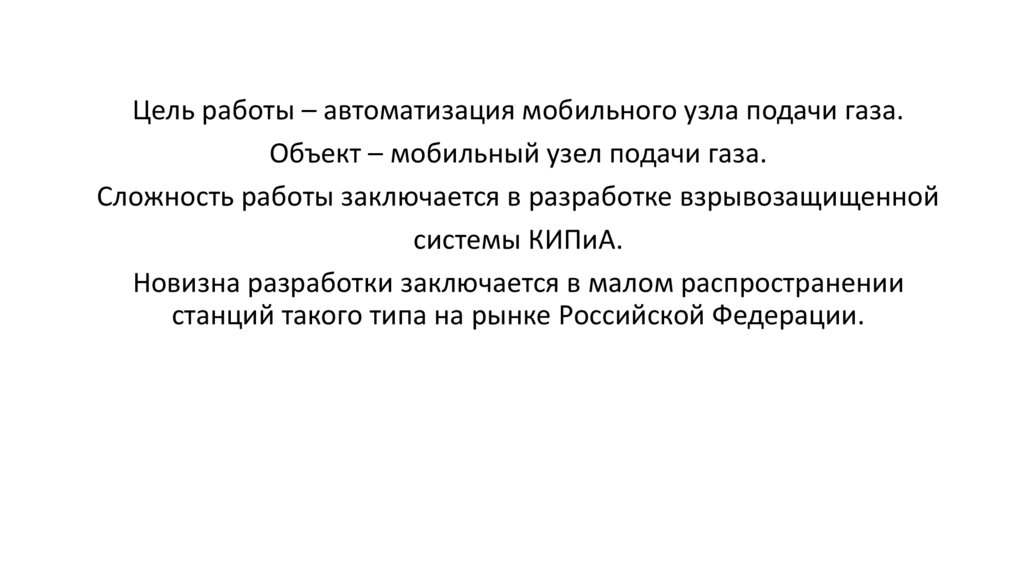 Цель работы – автоматизация мобильного узла подачи газа.Объект – мобильный узел подачи газа.