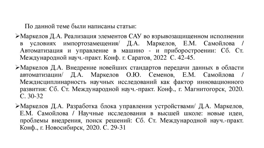 По данной теме были написаны статьи:Маркелов Д.А. Реализация элементов САУ во взрывозащищенном исполнении