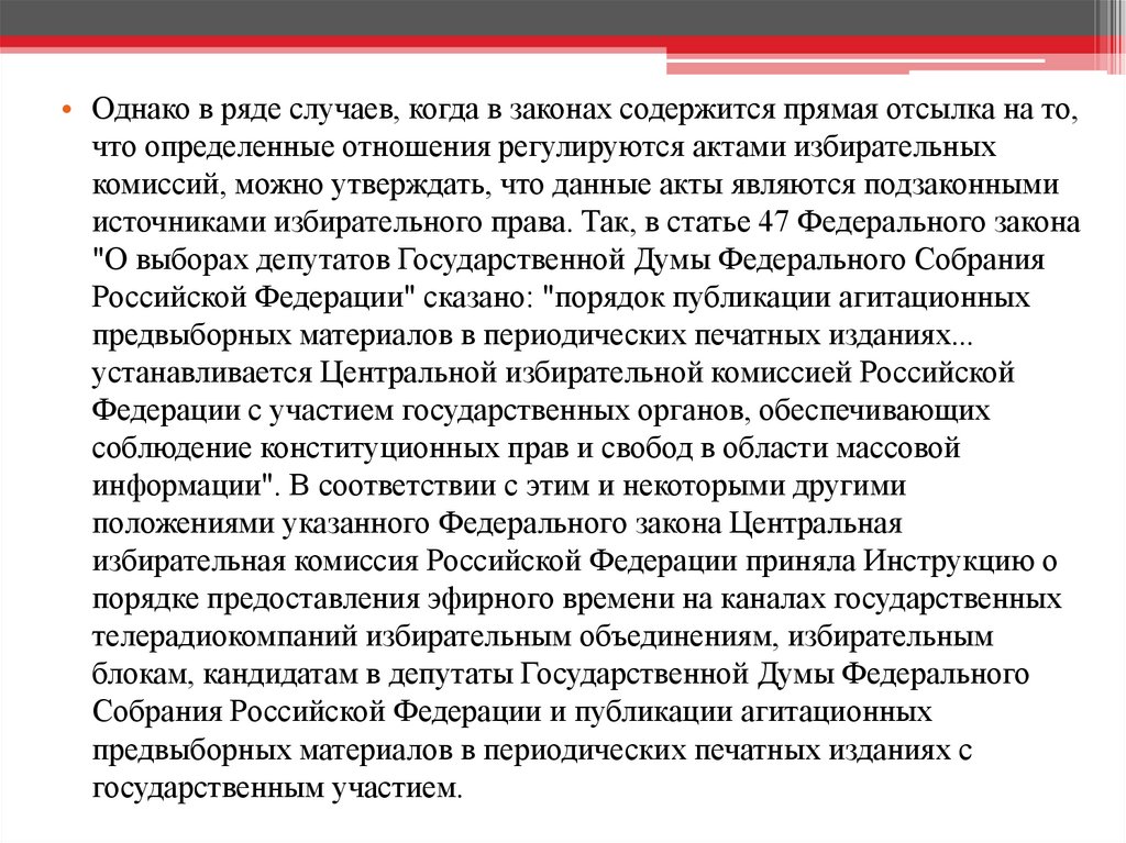 • Однако в ряде случаев, когда в законах содержится прямая отсылка на то,что определенные отношения регулируются актами избирательных