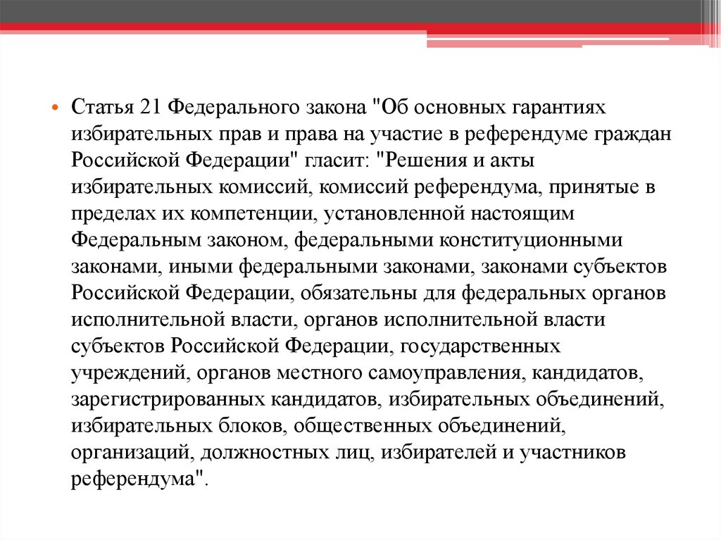 • Статья 21 Федерального закона "Об основных гарантияхизбирательных прав и права на участие в референдуме граждан