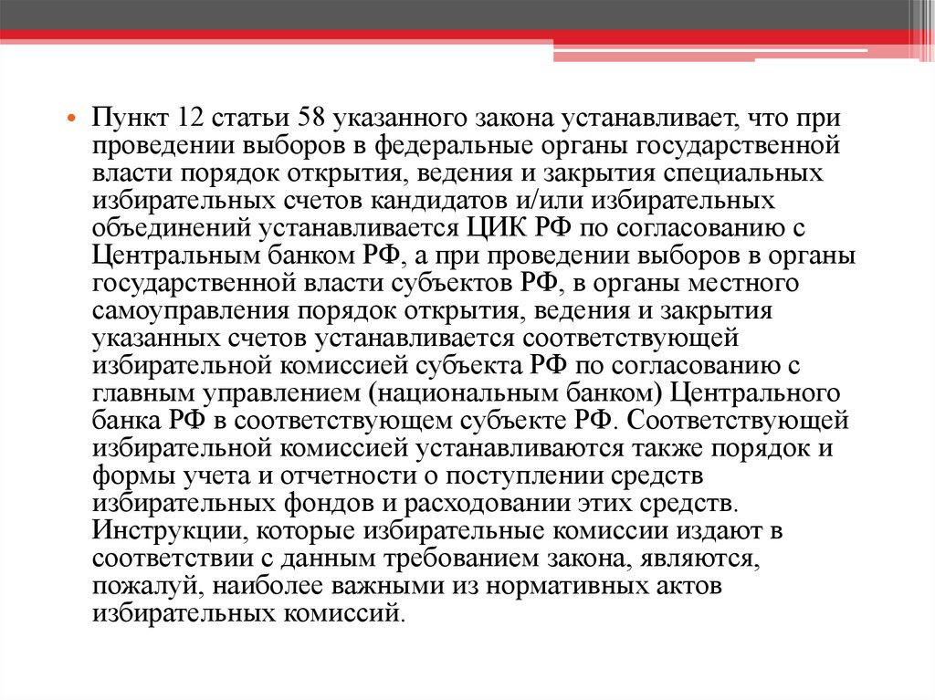 • Пункт 12 статьи 58 указанного закона устанавливает, что припроведении выборов в федеральные органы государственной