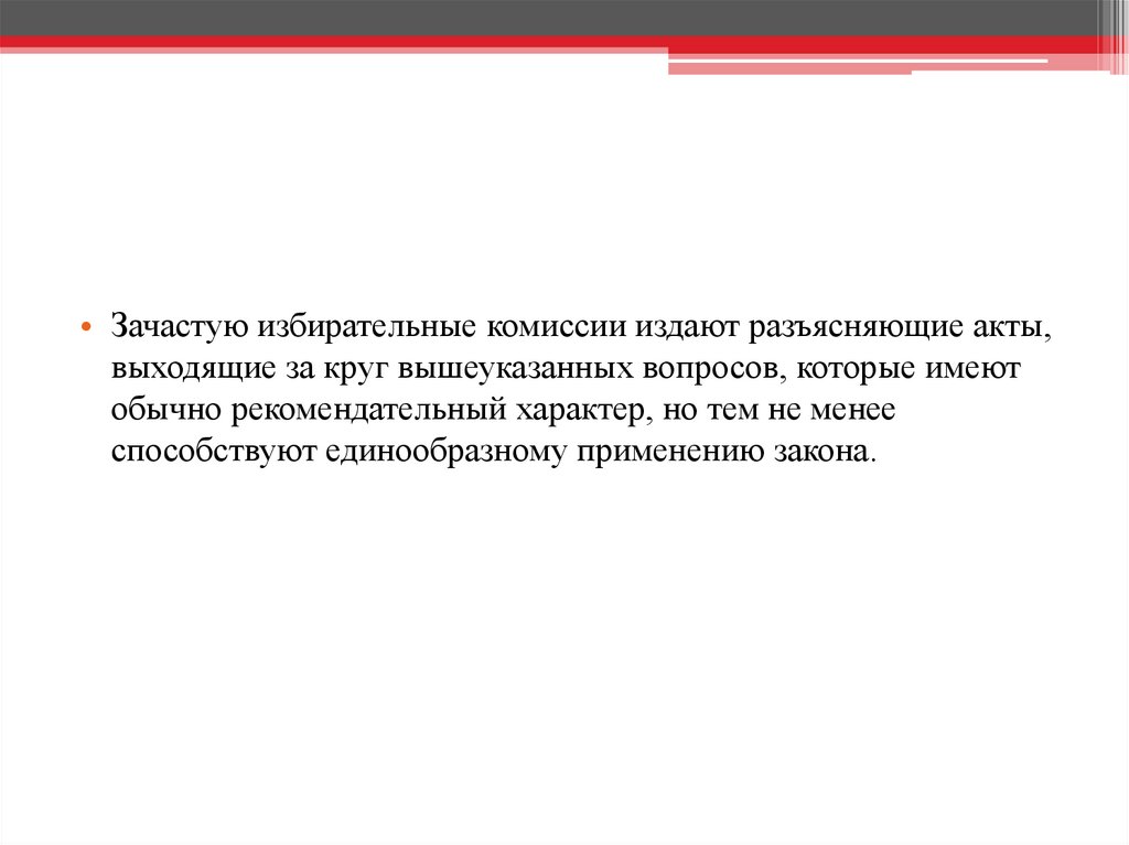 • Зачастую избирательные комиссии издают разъясняющие акты,выходящие за круг вышеуказанных вопросов, которые имеют