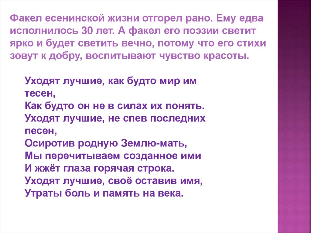 Факел есенинской жизни отгорел рано. Ему едваисполнилось 30 лет. А факел его поэзии светит