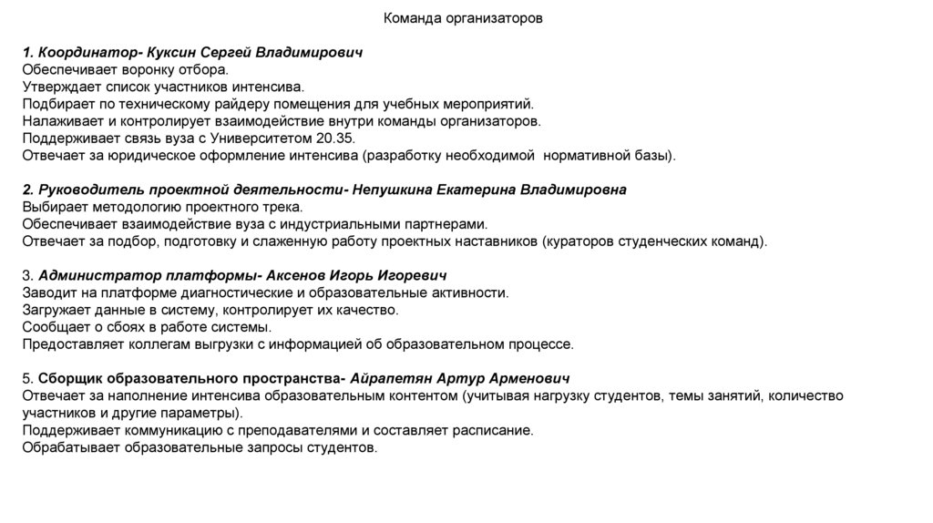 Отвечает за наполнение интенсива образовательным контентом (учитывая нагрузку студентов, темы занятий, количество