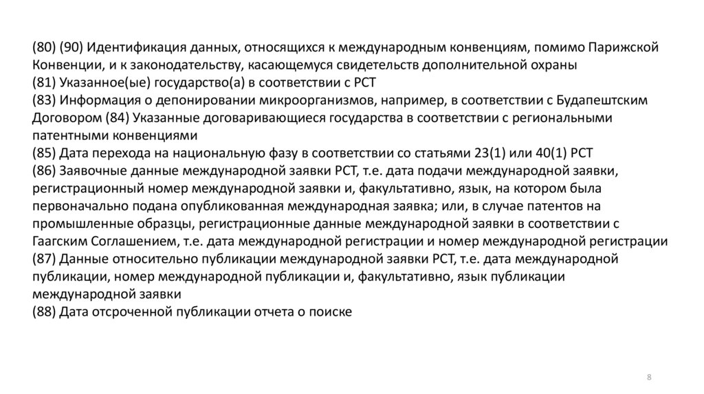 (80) (90) Идентификация данных, относящихся к международным конвенциям, помимо ПарижскойКонвенции, и к законодательству, касающемуся свидетельств дополнительной охраны